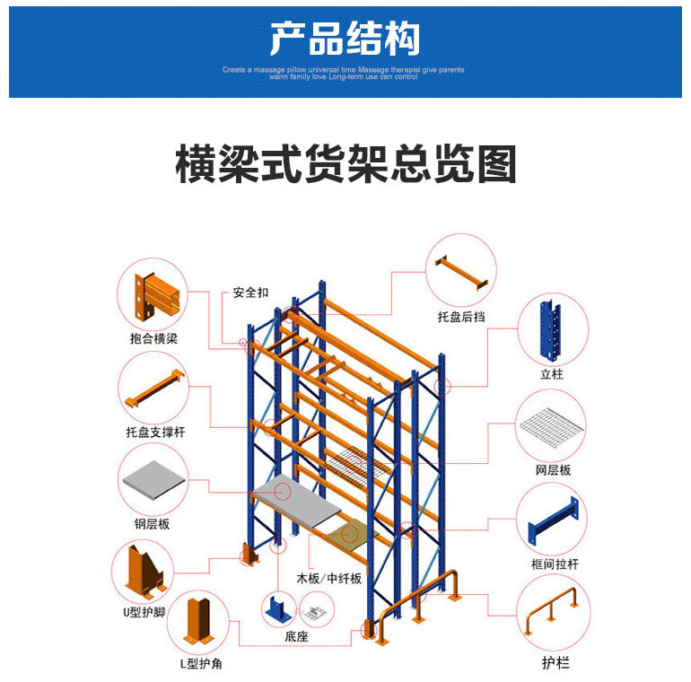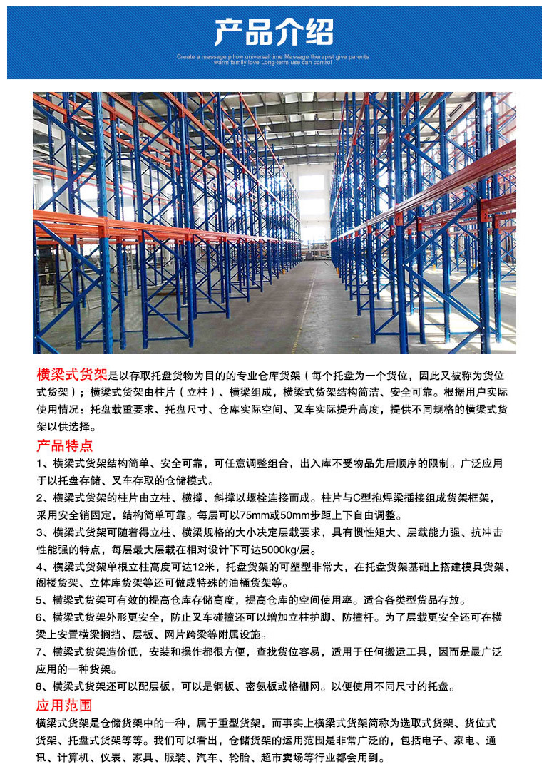 重型货架,又俗称横梁式货架,或称货位式货架,属于托盘货架类,在国内的各种仓储货架系统中最为常见一种货架形式。以立柱片+横梁形式的全组装结构,结构简明有效。可根据存储单元集装设备的特性加装如:隔档、钢层板(木层板)、金属丝网层、仓储笼导轨、油桶架等功能性附件。满足不同单元集装设备形式的货物存储。